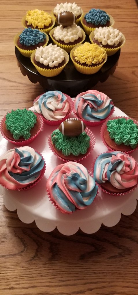 So why Superbowl cupcakes? Well, I wanted to go back to the game roots. Just like I went back to my root of who I was. So, for the Patriots I made a Ginger Ale spice cupcake with a cinnamon sugar cream cheese frosting. The Rams had a chocolate coffee cake with a plain buttercream. I mean, can we look at this frosting and how it looks!?!? I’m so proud and cannot wait to try more. Piping is such a calming thing to do. I can truthfully pipe for hours. *insert sexual innuendo here*